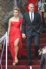 El vestido de la novia era un original traje de tirantes con velo, firmado por la diseñadora Teresa Helbig. En cambio el vistió un elegante traje azul.